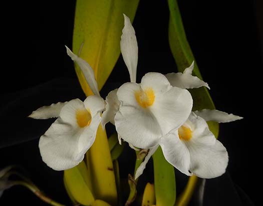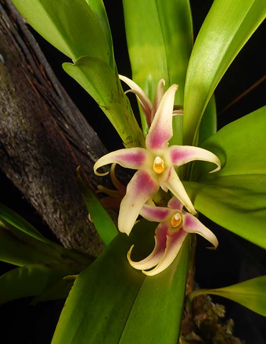 Maxilliaria bradyorumThis is a "climber", on a long tree=fern mount. The flowers emerge between the growths. Flowers are about 2 inches across. |