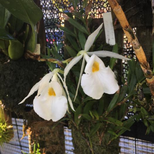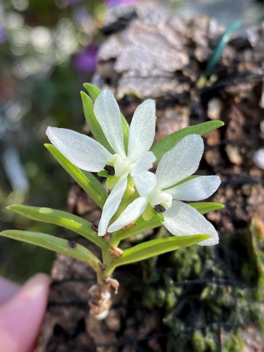 This Australian species has long and thin terete leaves until Autumn when it flush blooms with 1” green and white flowers. The blooms are long-lasting and quite fragrant. The literature says this is a “hot” grower and needs a dry winter rest, but does very well for me outside and gets rained on all winter. |