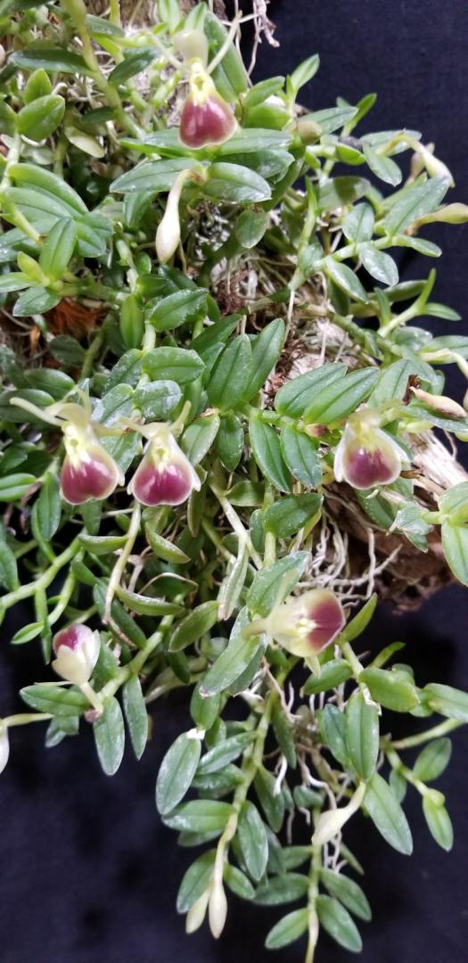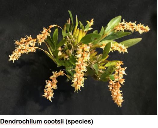 Dendrobium strogylanthumIndividual flowers are about an inch. The brush-like inflorescences emerge from bare canes. I don't particularly dry it out in the winter, but since it is mounted, it dries rapidly after watering. |
