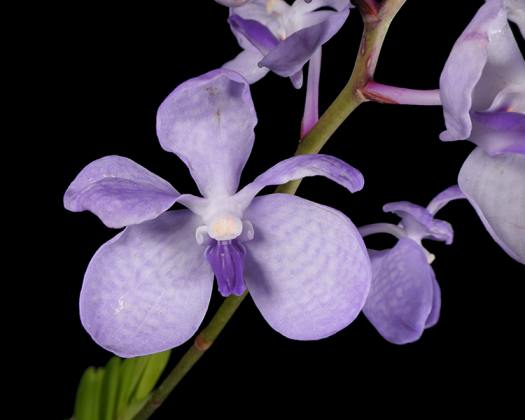 Vanda coeruleaThe species has a wide range of color, from almost white to very dark lavender. This one is in the middle of the color range. Ron Kaufmann has pointed out that the twist of the petals is characteristic of the species. If you have one with flat petals (classic Vanda form) it is likely a hybrid. The species is native to a wide range of southeast Asia, at elevations from about 900 to 1500 m, so has considerable cold tolerance. |