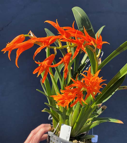 Dendrochilum coccineumLarge flowers for the genus. Each year I get more spikes, but they tend to open only about two at a time. Perhaps eventually I'll get a flush bloom but hasn't happened yet. |