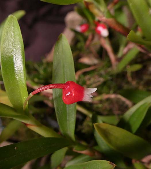 Mediocalcar versteegii (or not)That's what the tag says... but it sure looks the same as my Med. bifolium 'San Diego Zoo'. A lot of confusion between the two. See below for another opinion... My other Mediocalcar species were shy bloomers this year, but this M. versteegii (or likely Med. bifolium) came through. This species rambles and won’t stay in a pot, but has vivid red and white bell-shaped flowers scattered all over the plant.