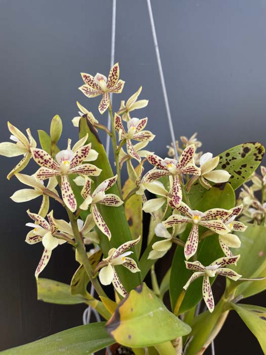 Ansellia africana 'Kenya Dark'Ansellia africana is the perfect outdoor orchid for the patio—it can handle some direct sun, doesn’t mind hot or cold (even a but of frost), and puts out large sprays of fragrant, long-lasting 2-3” yellow and brown flowers on 3’ tall (or more) plants. I grow mine in large pots filled with lava rock and a bit of large orchiata bark, to give the plant lots of space for roots, and for the weight to keep the plant from blowing over in the wind. It is known for creating a basket of roots that protrude upward out of the pot, in order to catch debris and organic matter. |