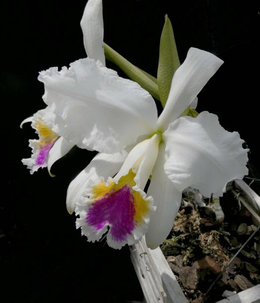 Cattleya intermediaf. amethystina top (mounted), f. coerulea bottom (basket). This species has quite a few color forms, and grows easily under backyard conditions with no shelter. Native to Brazil, Paraguay, Uruguay. The peloric form, f. aquinii, is in the background of many splash-petal hybrids. |