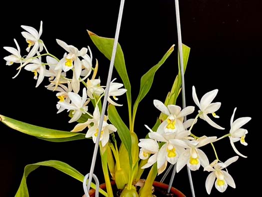 Coelogyne speciosaIt can bloom 2 or 3 times a year. The translucent flowers look very fragile, but actually have firm substance. This needs to grow in a basket, since flowers may emerge from nearly any direction. Native to Java and Sumatra, at elevations up to 1800 m. |