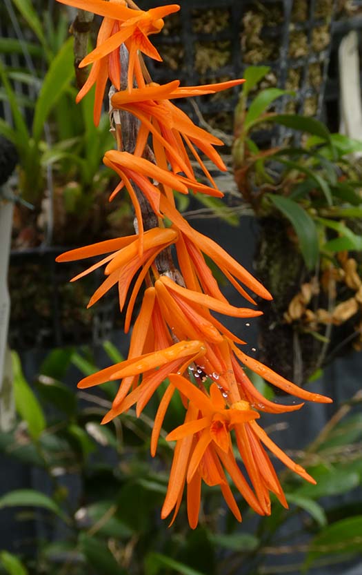 Renanthera pulchellaI can't find much information about this species. IOSPE has just one sentence, "Found in Myanmar as a hot growing epiphyte". However, it clearly grows over a much wider range and tolerates cold, since it has been growing and blooming on my patio for about 5 years. |