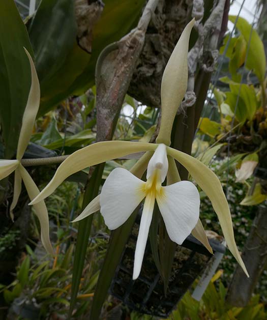 Angraecum germinyanumDelightful flowers, night-fragrant. It is in a 6 inch basket with sphaghnum, but much of the plant has extended itself well outside of the basket. Grown shady and damp. Native to Madagascar. |