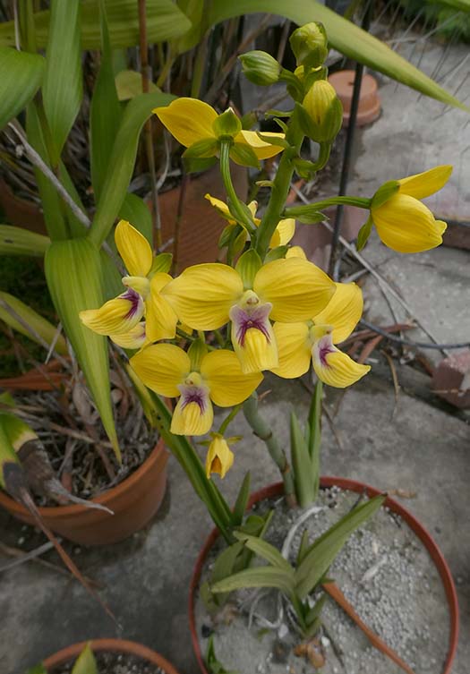 Eulophia speciosaAnother terrestrial from Africa that bloomed for Scott a full month before it bloomed for me. Last winter I didn't move it away from the sprinklers, so it got watered. And it is growing much better than in the years when dried it out. So lesson learned... it really does want winter watering. It is growing in sand. The next time I repot it, I will try adding a smal amount of organic matter. It can grow in a desert environment, but appears to not require that. |