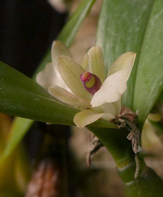 Cleisostoma simondiiCute little Vandaceous species with lots of terete leaves about 3 inches long. The flowers are easy to miss because colors are muted and only about 3/4 inch, but the plant has another spike that will bloom when this one is fading. It grows in a wood basket (think 3-dimensional mount) with no medium. When mounted it just goes off in all directions. Native to a wide area of east Himalaya, China-Hainan, and much of southeast Asia. |
