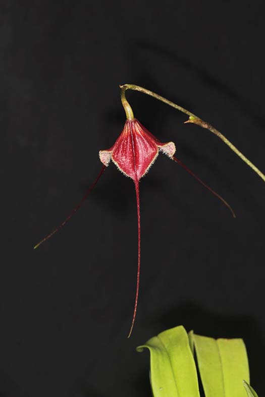 Masdevallia tovarensisA cool to cold growing epiphyte growing endemically in Venezuela at elevations of 1600 to 2400 meters. This plant is growing in a cool greenhouse as both a mounted plant and in clay pots filled with sphagnum moss. It usually has 2 to 3 flowers per spike but this plant was recently transplanted and only produced one flower per spike. |