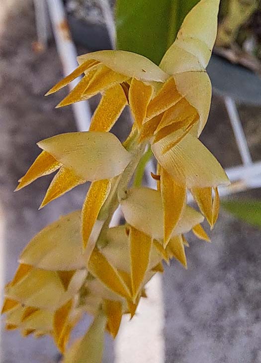 Bulbophyllum pardolatumGrows well outdoors and floriferous, but alas the flowers on this mini are only open for a couple hours in the morning and then close by mid-day, but re-open over many days. |