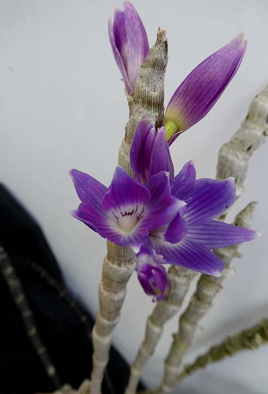 Dendrobium victoriae-reginaeNative to the Philippines, elevation 1300-2650 m. It can bloom repeadedly from bare canes, and bloom 2-3 times a year. This species does tend to want good water - mine is growing much better since I started using RO water.