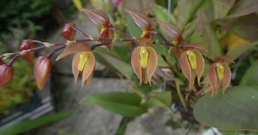 Masdevallia floribundaI Find this to be the easiest Masdevallia to grow outdoors—it seems to tolerate the summer hot/dry spells better than others, even though it is mounted and not given any special care. Appropriately named for abundant blooms. |