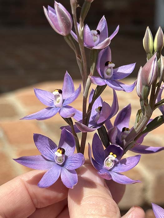Thelymitra dentata x glaucophylla "striped"is primary cross is one of my favorites. While the flowers are overall more lavender than blue, they have distinctly blue stripes. As you can see, the plants are also quite prolific and put on a good show. |