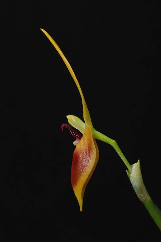 Masdevallia pinnochioFound in Ecuador at elevations of 1300 to 1500 meters as a cool growing epiphyte. Will continue to bloom on each spike if you keep it happy. Growing in a bark and perlite mixture in a plastic pot placed in a cool greenhouse. |