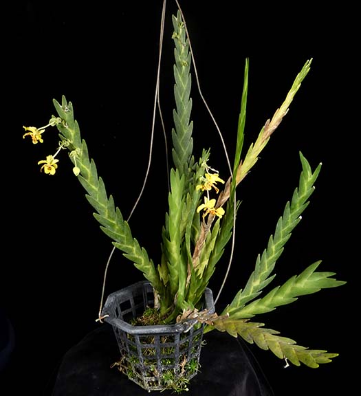Lockhartia oerstediiNative to southern Mexico and much of Central America. It can grow as high as 2700 m, but also at lower elevations. The leaves have an interesting "braided" look. A growth can bloom over a few years, even when looking fairly old. It's very easy to propagate by division, since each growth seems to root inependently - just peel one off, stick in some sphagnum, and it takes off. |