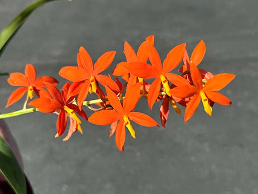 Renanthera pulchellaA smaller Renanthera from Myanmar with pretty 3” yellow/orange/red flowers. This is listed as a “warm-hot” or “hot” grower but seems to grow happily outside for me. |